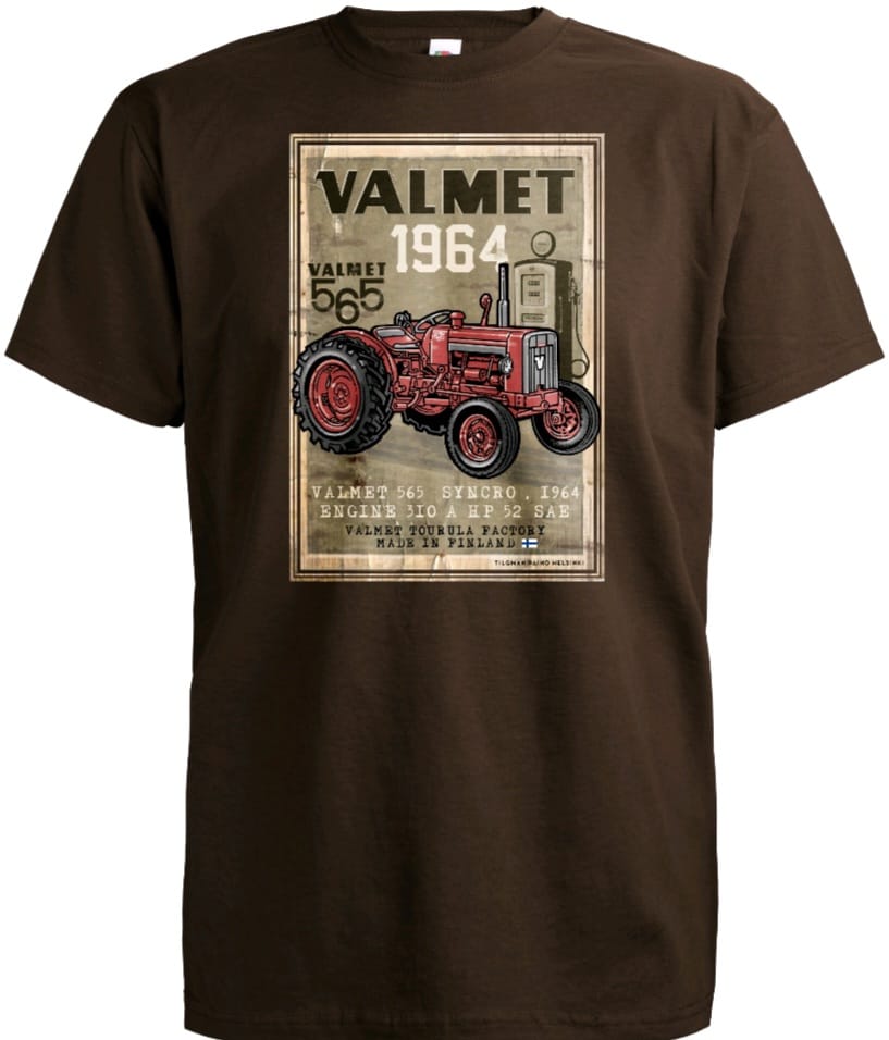 Valmet 565 syncro t-paita. Tumman ruskea, koot 92-140 cm, S-4XL. Lasten koot 15 €, aikuisten koot 17 €.